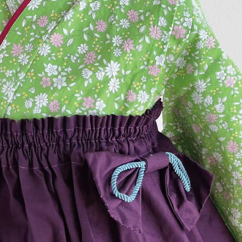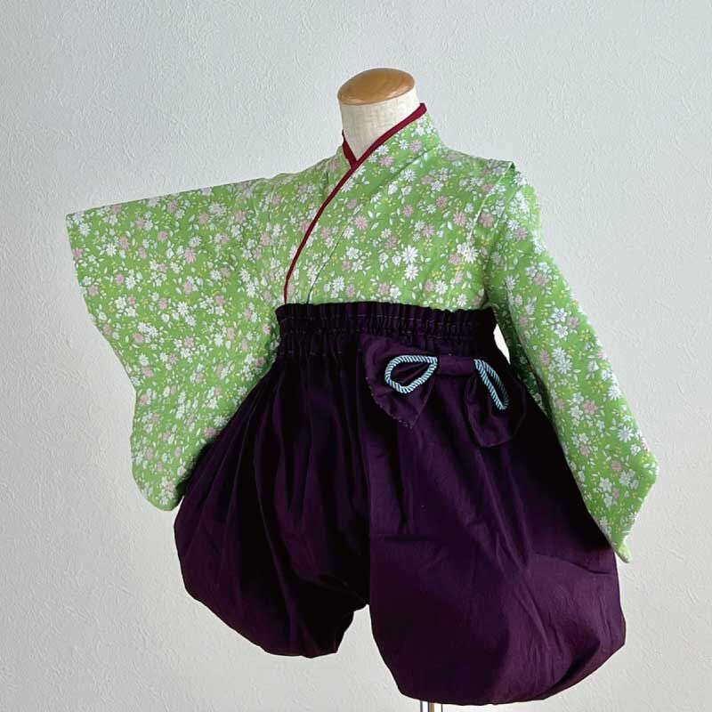 【ベビー袴 】⻩緑⼩花・重ね襟 × 袴 紫・袴リボン ・飾り紐